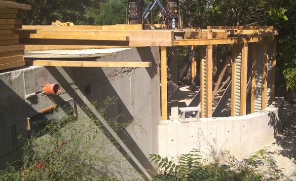 A körházra az építészeti előírások miatt került nyeregtető, viszont szükség volt még plusz tetőfelületre, a víz gyűjtéshez – amit természetesen a használathoz lett méretezve – így jött az ötlet a fedett kocsibeállóra. Az alapozás tervezésénél pedig kiderült, hogy az altalaj miatt szükséges alapmélységnek köszönhetően gyakorlatilag majdnem megvan a medence három fala, így már nem volt kérdés, hogy a víztározó medence is elkészüljön.